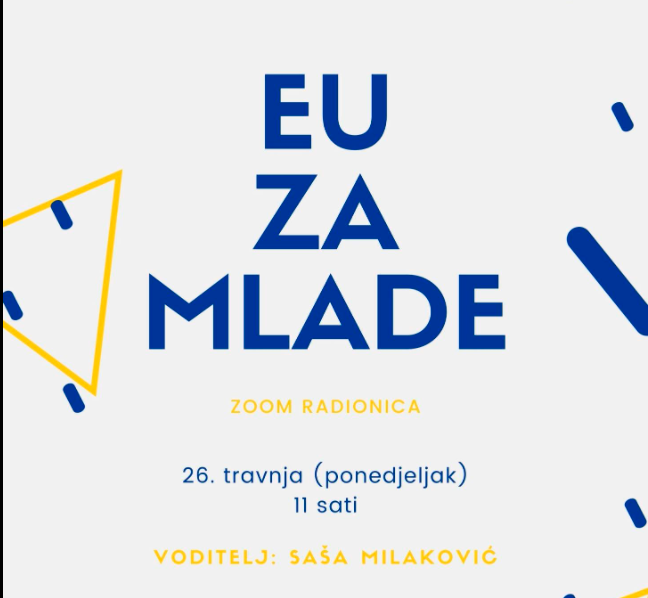 Radionica “EU za mlade” osječkog DKolektiva provodit će se u ponedjeljak, 26. travnja, od 11 do 12:30 preko Zoom platforme. Radionicu će voditi Saša Milaković, a provodi se u sklopu WakeUP! projekta, čiji je cilj mlade osnažiti za aktivno, demokratsko, europsko i informirano građanstvo. Namijenjena je mladima od 15 do 29 godina, no uvijek prihvaćaju sve zainteresirane građane.