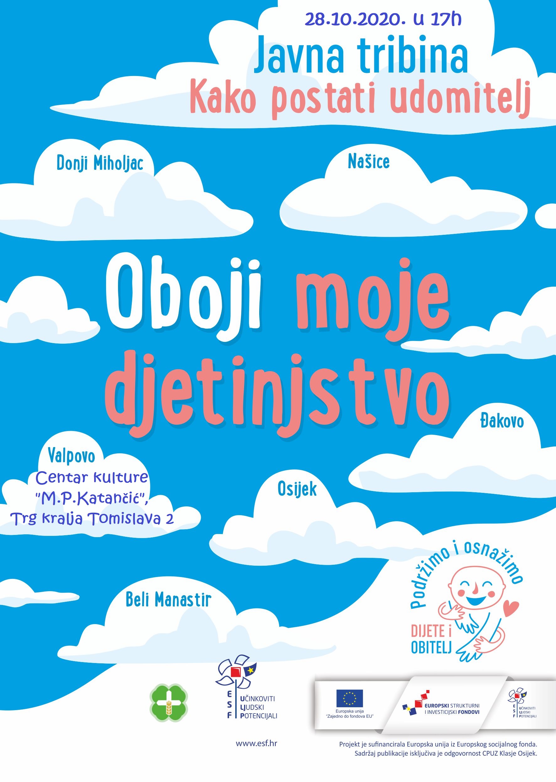 Ovim putem, Centar za pružanje usluga u zajednici Klasje Osijek poziva  na  tribinu o udomiteljstvu za djecu „Kako postati udomitelj“ koja će se održati  u Valpovu, u srijedu 28.10.2020. u 17 sati u prostoru Centra kulture „M.P.Katančića, na adresi Trg kralja Tomislava 2.