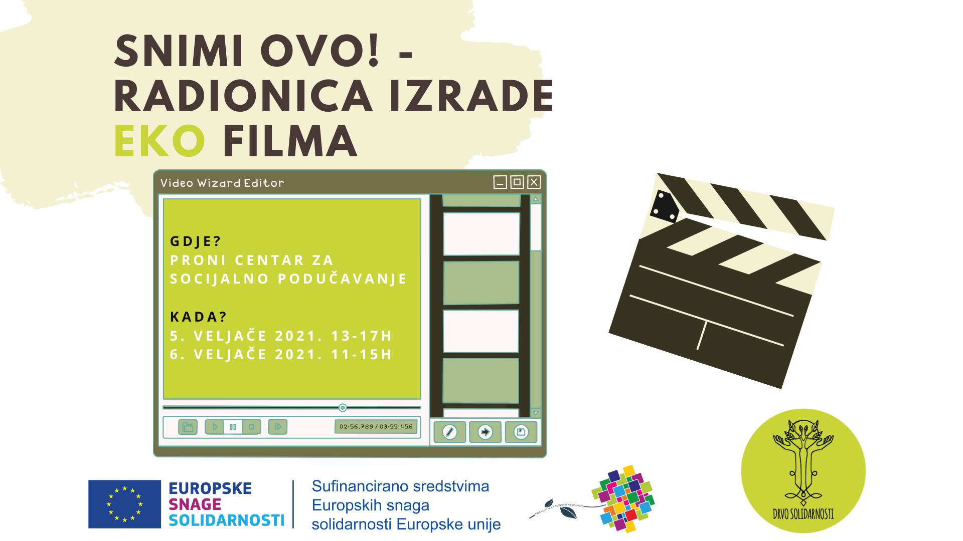 U skladu s epidemiološkim mjerama, „Snimi ovo – radionica izrade eko filma“ održat će se u dva termina – prvi termin bit će u petak (5. veljače 2021.) od 13 do 17h, a drugi termin bit će u subotu (6. veljače 2021.) od 11 do 15h. Mjesto održavanja radionice je PRONI Centar za socijalno podučavanje. Voditelj radionice je akademski filmski montažer Antun Balog (TonniB video produkcija). Prijave su otvorene za mlade između 18 i 30 godina.