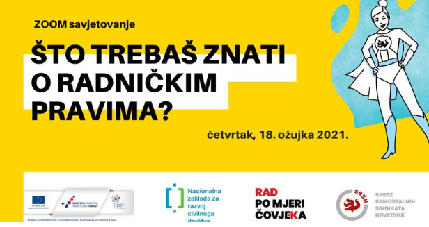 Savjetovanje Što trebaš znati o radničkim pravima? organizira Savez samostalnih sindikata Hrvatske (SSSH) preko aplikacije ZOOM. Prijavi se na savjetovanje o radničkim pravima preko sljedećeg linka: https://forms.gle/GHb4jFMEW1RXndPf8